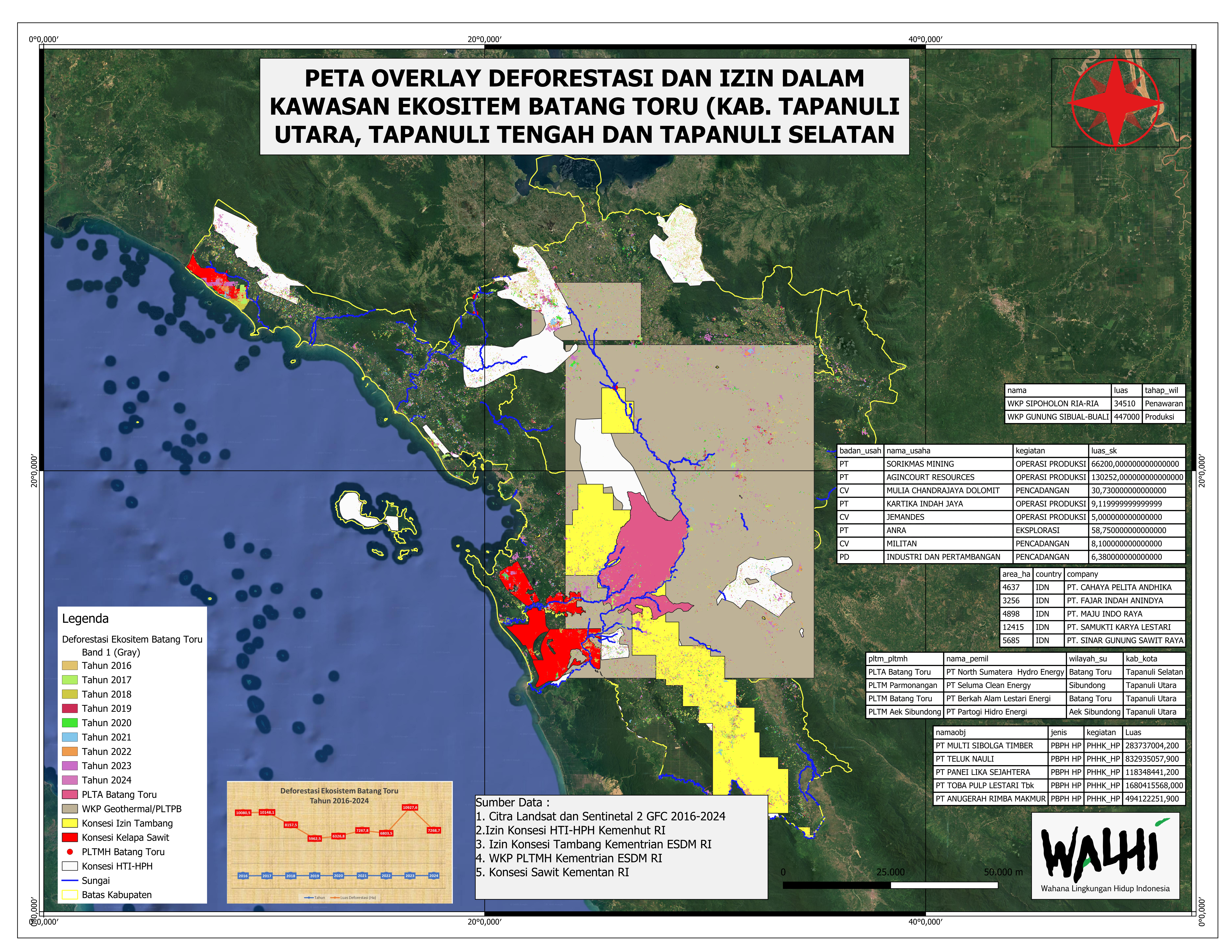 Riandra Purba, Direktur Eksekutif Daerah WALHI Sumatera Utara menyampaikan “Wilayah yang paling kritis adalah Tapanuli Tengah, Sibolga dan Tapanuli Selatan yang hulunya ada di ekosistem Batang Toru. Dalam delapan tahun terakhir WALHI Sumut mengkritisi terus-menerus model pengelolaan Batang Toru, misalnya PLTA Batang Toru, selain akan memutus habitat orang utan dan harimau, juga merusak badan-badan sungai dan aliran sungai yang menjadi daya dukung dan daya tampung lingkungan. Selain itu juga pertambangan emas yang berada tepat di sungai Batang Toru. Desa-desa lain di kecamatan Sipirok juga ada aktivitas kemitraan kebun kayu dengan PT Toba Pulp Lestari yang akhirnya mengalihfungsikan hutan. Semua aktitas eksploitasi dilegalisasi oleh pemerintah melalui proses pelepasan kawasan hutan untuk izin melalui revisi tata ruang.”