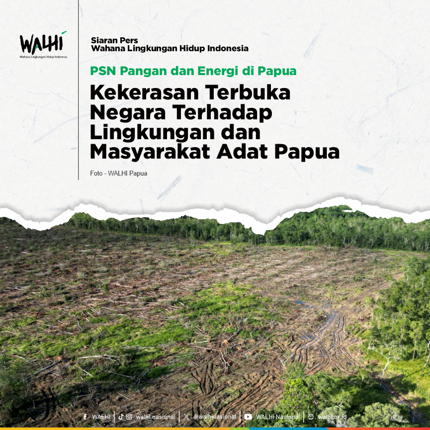 Jakarta, 6 Oktober 2025. Rencana pelepasan hutan seluas 486.939 hektar hutan menjadi areal peruntukan lain untuk mendukung Percepatan Pembangunan Kawasan Swasembada Pangan, Energi, dan Air Nasional Merauke, Provinsi Papua Selatan tanpa mempertimbangkan keberlanjutan lingkungan dan keselamatan masyarakat adat di Papua Selatan adalah bentuk kekerasan terbuka oleh negara. Hal ini diperparah dengan pernyataan Menteri ATR/BPN yang menyatakan bahwa wilayah hutan yang akan dilepaskan adalah milik negara dan tidak ada yang bermukim di sana.